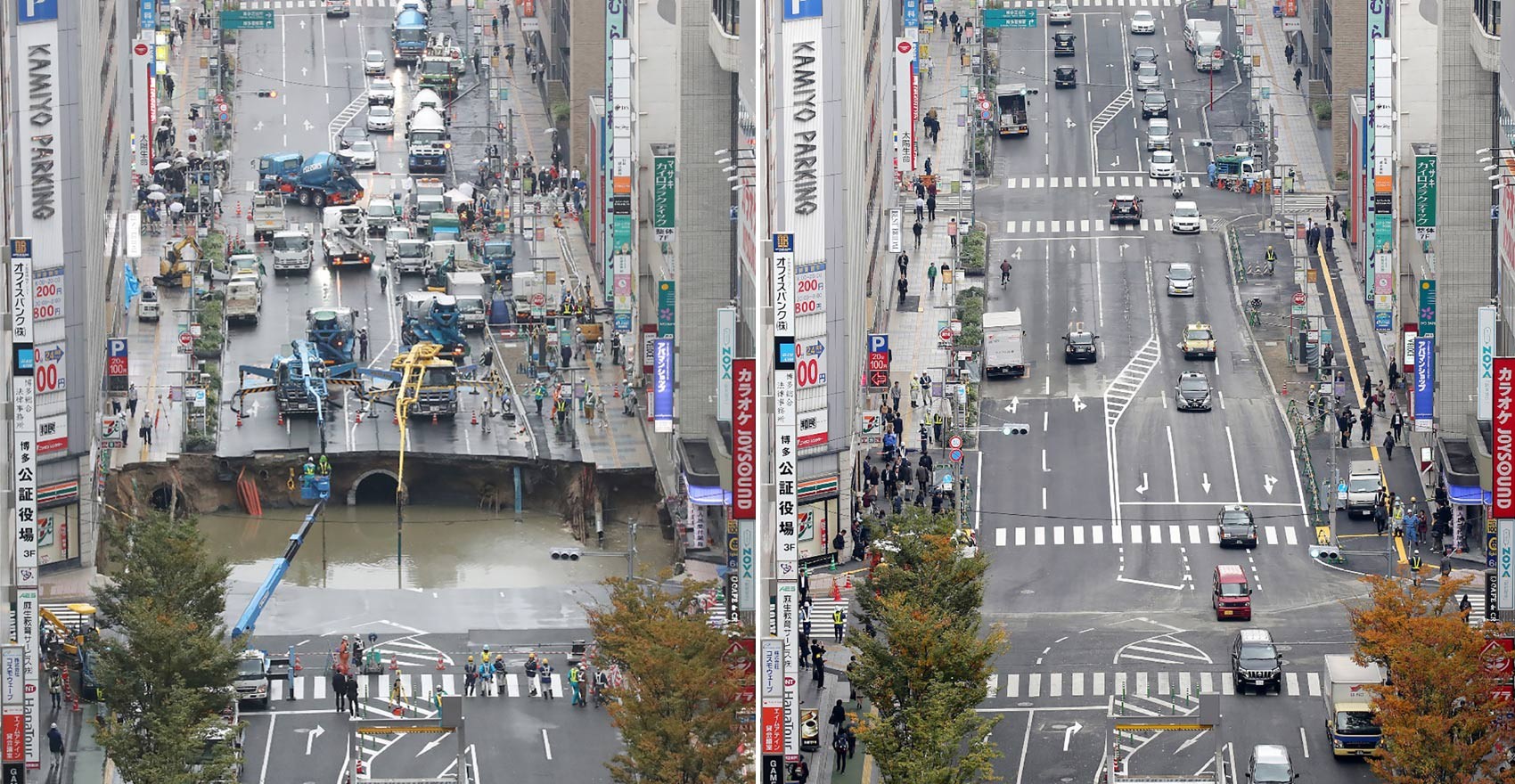 A grande cratera de cerca de 300 metros quadrados que apareceu na terça-feira (8) da semana passada na região central da cidade de Fukuoka, no Japão, causou causando interrupção do tráfego. Uma semana depois do incidente, o local já foi reaberto, numa demonstração típica do esforço e eficiência japoneses.