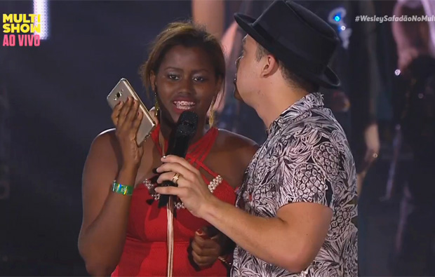 O cantor perguntou quem tinha um ex-namorado e desejava mandar um recado para ele, e uma jovem no público se ofereceu. Safadão então pediu que ela subisse para contar a história. Ela disse que terminou o relacionamento há um ano e o ex continua atrás dela. “E a mulher dele está aqui”, revelou.