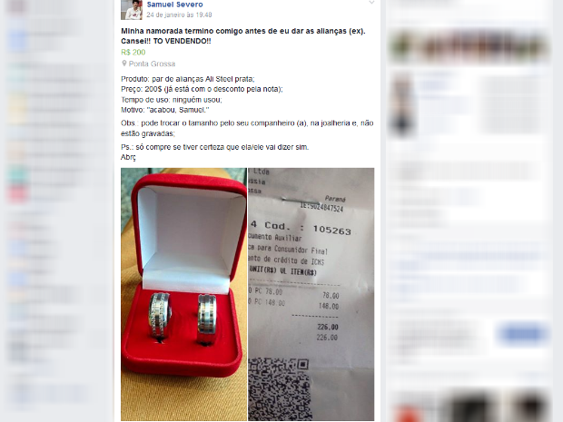 Ainda segundo Samuel, a justificativa da namorada para o término foi a de que ela queria curtir a vida de solteira. O jovem então decidiu não ficar no prejuízo e colocou os anéis para vender. Em poucos minutos, o par de alianças foi comprado.