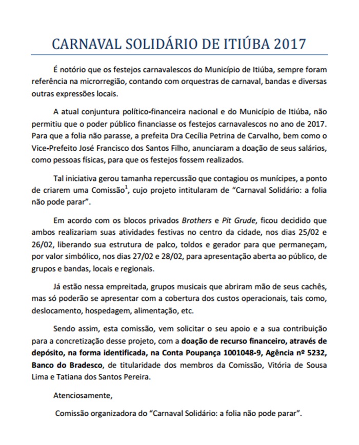 A partir dessa iniciativa, contagiou outros munícipes que se uniram em prol da festa e foi criada uma comissão organizadora que ampliou o apoio e a campanha de arrecadação conforme carta divulgada. Leia abaixo