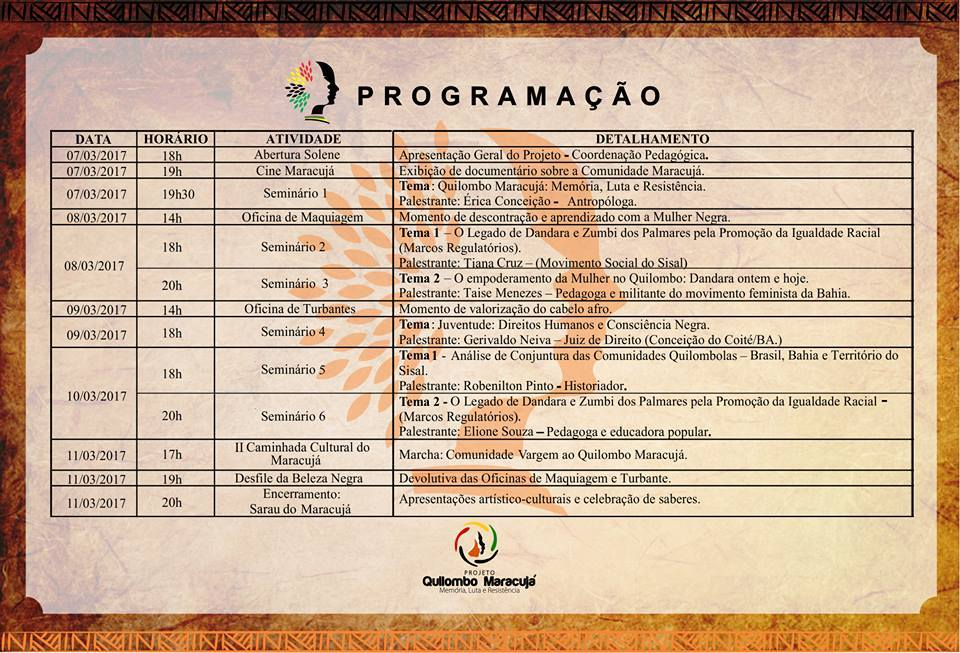 Confira Programação Completa, em detalhes, da I Semana da Afirmação Quilombola do Maracujá, que é a culminância do Projeto: