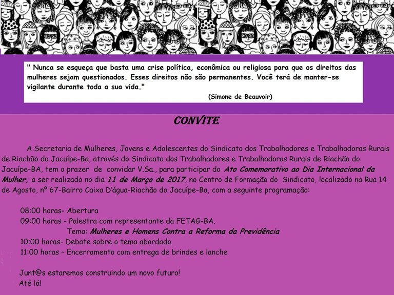 Por isso o Sindicato dos Trabalhadores e Trabalhadoras Rurais de Riachão do Jacuípe-BA e Secretaria de Mulheres, Jovens e Adolescentes, convidam todas as trabalhadoras e trabalhadores rurais, como também os trabalhadores urbanos, além das pessoas comprometidas com a resistência à retirada de Direitos de HOMENS E MULHERES para juntos lutarmos contra os desmontes da Reforma da Previdência e a retirada de nossos direitos, no Ato do Dia Internacional da Mulher 2017, que acontecerá no dia 11 de Março de 2017, no Centro de Formação do Sindicato dos Trabalhadores e Trabalhadoras, situado na Rua 14 de Agosto, nº 67, Bairro Caixa D’água- Riachão do Jacuípe-BA, a partir das 08:00 horas.
