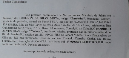 No mesmo mandado, pede a prisão também de outro individuo, o Rodrigo Alves Dias,vulgo ‘Carioca’morador do Bairro Fluminense.