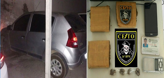 A PM informou ainda que foi feito um cerco e que após várias tentativas os policiais conseguiram capturar o suspeito e apreender consigo 04 dolões de maconha, uma balança de precisão, três tabletes de maconha prensada, um aparelho celular marca LG e um veículo Renault Sandero com restrição de roubo, que segundo o próprio Bruno foi roubado em Salvador há dois meses.