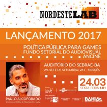 No evento de lançamento, além da apresentação das inovações para o NordesteLab 2017, será apresentado por Paulo Alcoforado, Secretário de Políticas de Financiamento/ANCINE, o painel “Política Pública para Games – Fundo Setorial do Audiovisual – Ancine”.