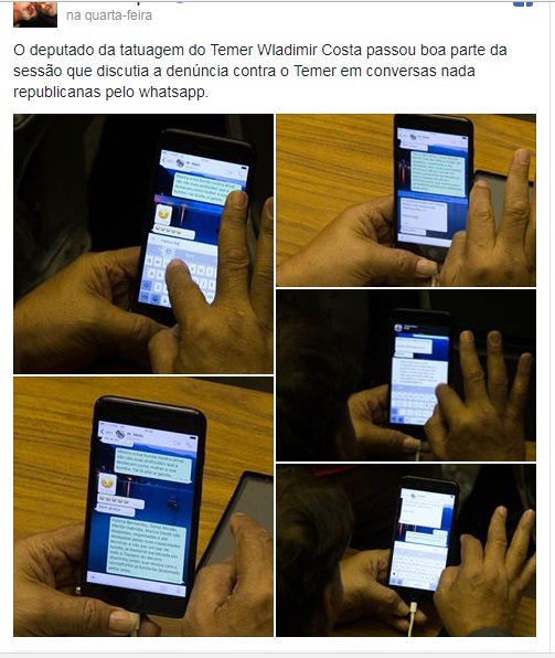 Durante a votação sobre a denúncia de corrupção passiva de Michel Temer, que aconteceu na última quarta-feira (2) na Câmara dos Deputados, o deputado Wladimir Costa, do Solidariedade, do Pará, foi visto pedindo nudes por WhatsApp. O responsável pelo flagra foi o fotógrafo Lula Marques, da Agência PT, que fez questão de debochar sobre a situação em uma postagem no Facebook que dizia: “conversas nada republicanas”.