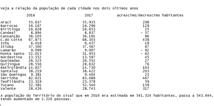 De acordo com o IBGE quase 25% dos municípios tiveram redução de população em 2017, no Território do sisal têm três que apontou redução populacional. Candeal, Lamarão e Monte Santo.