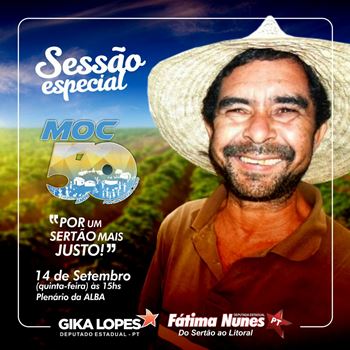 Com o objetivo de comemorar os 50 anos de fundação do Movimento de Organização Comunitária (MOC) na Bahia, os deputados estaduais Gika Lopes e Fátima Nunes, ambos do Partido dos Trabalhadores (PT), promovem no próximo dia 14, uma sessão especial, a partir das 15 horas, no plenário da Assembleia Legislativa da Bahia (Alba).