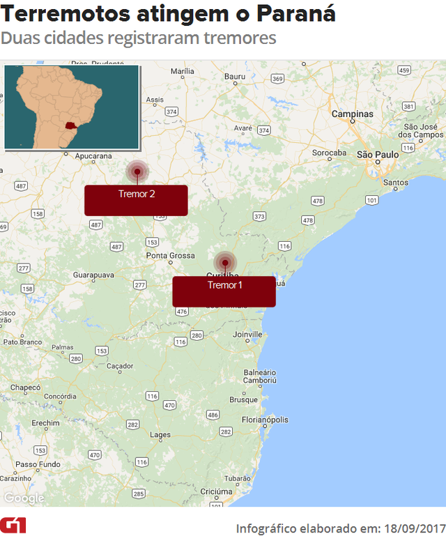 O primeiro deles, registrado à 0h16, teve 4,5 graus de magnitude com o epicentro na cidade de Rio Branco do Sul, cerca de 50 quilômetros de Curitiba (o site da USP chegou a informar a cidade de Itaperuçu, mas corrigiu a informação por volta das 4h45).