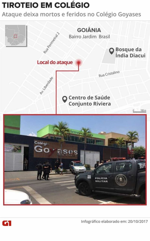Um estudante de 14 anos atirou na tarde desta sexta-feira (20) dentro do Colégio Goyases, escola particular de ensino infantil e fundamental, em Goiânia. De acordo com o Corpo de Bombeiros e Polícia Militar, dois estudantes morreram e outros quatro ficaram feridos na unidade, localizada no Conjunto Riviera, bairro de classe média.