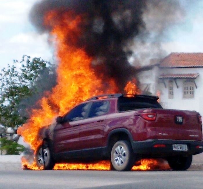 Um veículo Fiat Toro, de cor vermelha, ano 2016/2017, com placas de Salvador (BA), pegou fogo na rodovia BA-120, perímetro urbano de Valente, na manhã desta sexta-feira (10). O incidente foi registrado na altura da Praça do Cristo, na saída para Santaluz.