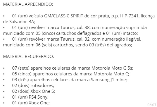 A Policia divulgou também o material produto do roubo recuperado, armas e veículos usados pelos criminosos