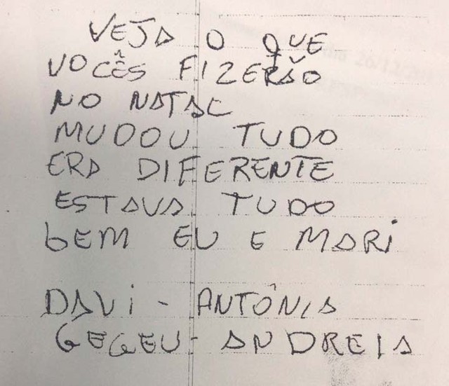 Segundo o delegado Guilherme Machado, coordenador da 2ª Delegacia de Homicídios (DH/Central) e responsável pelo caso, no bilhete escrito pelo comerciante Jailson Santos Mendonça, de 46 anos, tinha: “Veja o que vocês fizerão [sic] no Natal. Mudou tudo. Era diferente. Estava tudo bem eu e Mari. Davi-Antônia-Gegeu-Andreia”. A polícia não detalhou quem são as pessoas citadas no bilhete, além da vítima, Maridalva da Silva Gonçalves, e do suspeito.