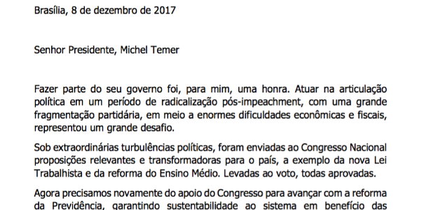 “Fazer parte do seu governo foi, para mim, uma honra. Atuar na articulação política em um período de radicalização pós-impeachment, com uma grande fragmentação partidária, em meio a enormes dificuldades econômicas e fiscais, representou um grande desafio”, escreveu ele na carta.