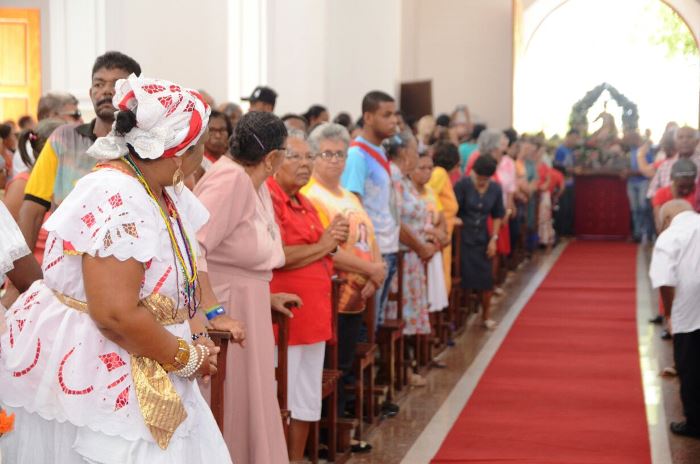 Antes do inicio da missa, um grupo de membros da umbanda, sob a liderança da mãe de santo do terreiro Cosme e Damião, localizado as margens da BR 324, repetiram o ato que já fazem há décadas, ou seja, passar pelo centro da igreja, em direção ao altar principal, como forma de homenagear a santa. Dona Nicinha, mãe de santo do terreiro, falou ao CN que espera com muita ansiedade este dia, pois Iansã tem ajudado a todos que a procura.