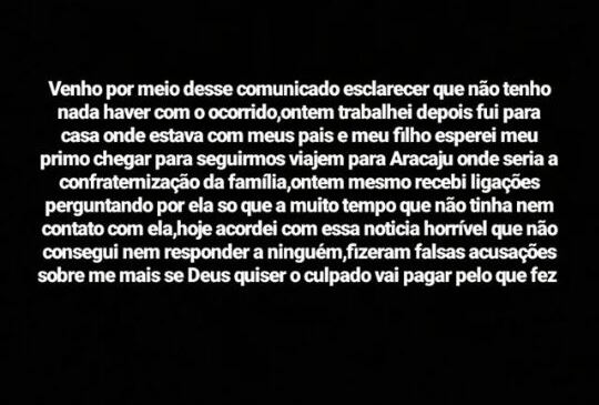Defesa do ex-marido – Sentindo-se ofendido pelas redes sociais, onde foi acusado pelo crime, o ex-marido de Daiane, Lucas Carvalho, postou em sua página no instagran uma mensagem em que afirmava não ter nada a ver com o corrido e há muito tempo não mantinha contato com a ex-mulher, inclusive relatando seus últimos passos.A suspeita maior se deu pelo fato de o mesmo viajar para Aracaju no dia do desaparecimento.