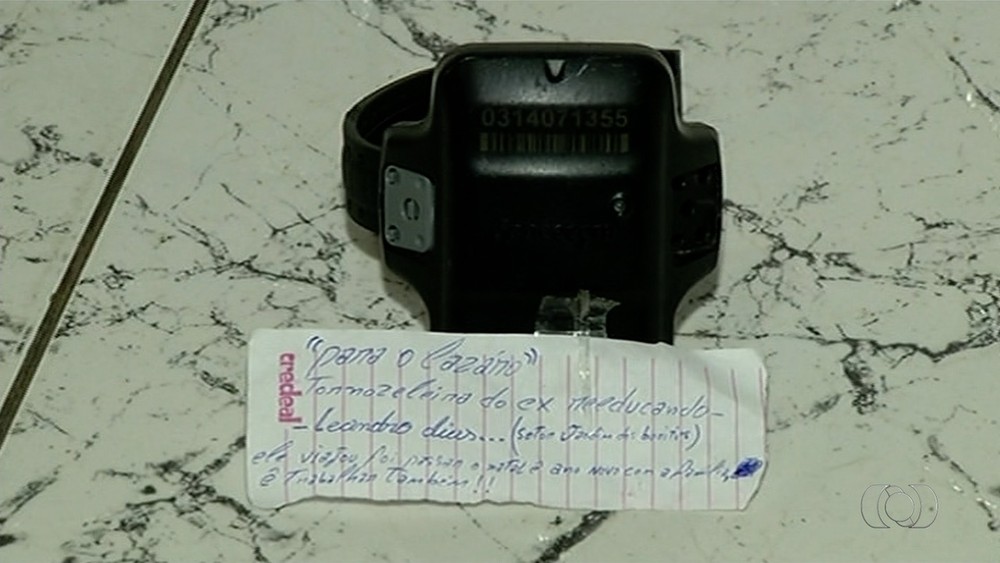 Tornozeleira e bilhete foram encontrados em delegacia de Gurupi (Foto: Reprodução/TV Anhanguera)Uma tornozeleira eletrônica foi deixada na Central de Flagrantes de Gurupi, sul do Tocantins. O detalhe é que junto com o equipamento foi encontrado um bilhete com o nome do preso e o motivo de ele ter violado as regras de monitoramento. A mensagem diz que Leandro Dias viajou para passar o Natal e o Ano Novo com a família.
