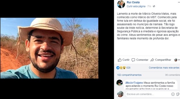 O governador Rui Costa lamentou a morte do líder do MST. “Lamento a morte de Márcio Oliveira Matos, mais conhecido como Marcio do MST. Conhecido pela firme luta em defesa da igualdade social, ele foi assassinado no município de Iramaia. Tão logo soube da triste notícia, determinei à Secretaria de Segurança Pública a imediata e rigorosa apuração do crime. Meus sentimentos de pesar aos amigos e familiares neste momento de profunda dor”, afirmou Rui.