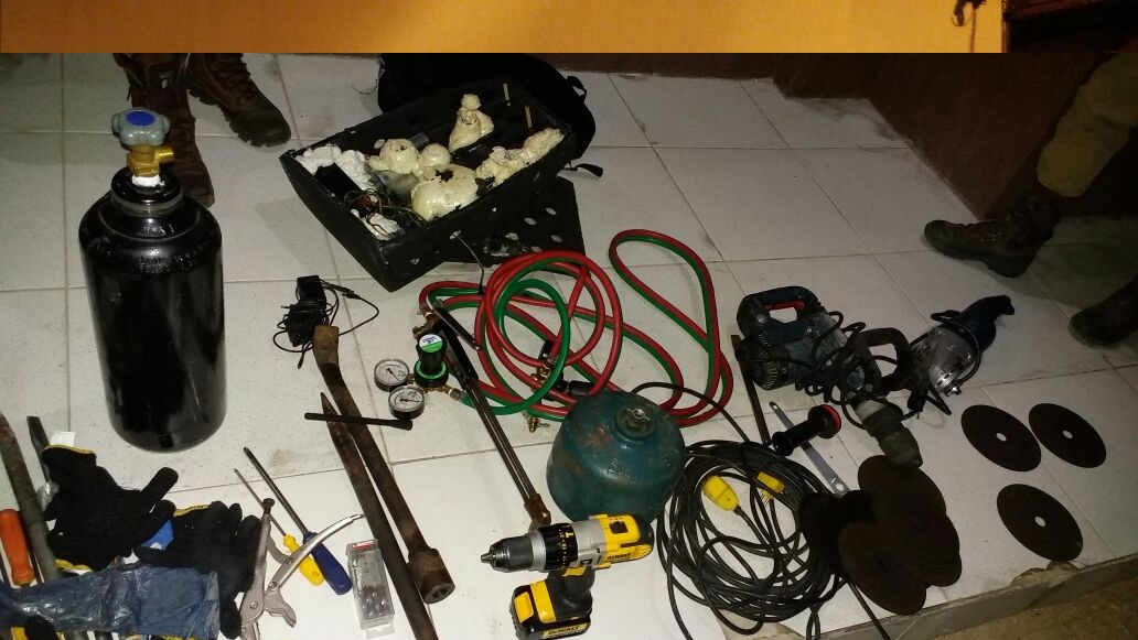 A PM apresentou a Delegacia Ramon dos Santos Alves, 25 anos e Jefferson Aquino Boulhoza Concha, 23, com eles vários objetos apreendidos que seriam usados na ação criminosa: quatro celulares, bloqueador de celular, lixadeira, parafusadeira, três ponteiros grande e um médio,pares de luvas, chaves de fenda, alicate de pressão,brocas,extensão, botijão de gás pequeno, maçarico e veículo Renault Logan de cor prata, placa QMR 0376,licença de Belo Horizonte – MG.