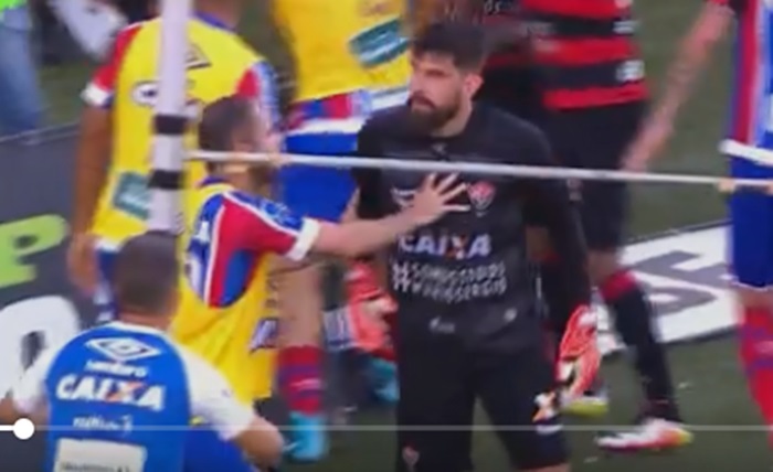 O goleiro foi um dos que iniciaram a grande polêmica do Ba-Vi deste domingo (18), no Barradão, quando segurou o meia Vinícius, do Bahia, que comemorou o gol de empate provocando a torcida do Vitória.