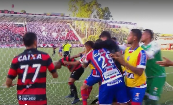 Jogadores iniciaram uma briga generalizada inclusive jogadores do banco do Bahia partiram para vias de fatos com atletas rubros negros, depois de aproximadamente 10 minutos de paralisação o arbitro Jailson de Freitas começou o festival de cartões. Primeiro para os jogadores do Bahia Edson que estava no banco e agrediu o jogador Neilton, o também reserva o zagueiro Rodrigo Becão. Amarelou o goleiro reserva Anderson e expulsou o ‘nocauteado’ Vinicius, talvez pela comemoração, já que ele não reagiu as agressões.