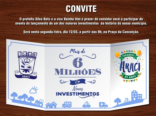 O prefeito de Araci, Silva Neto (PDT), anunciou que na próxima segunda-feira, 12, irá entregar a comunidade equipamentos, veículos e obras, cujo investimento ultrapassa a quantia de R$ 6 milhões. Segundo o prefeito, os investimentos contemplam a aquisição de veículos e equipamentos para melhor servir à população, quadra poliesportiva, seguro safra e pavimentação.