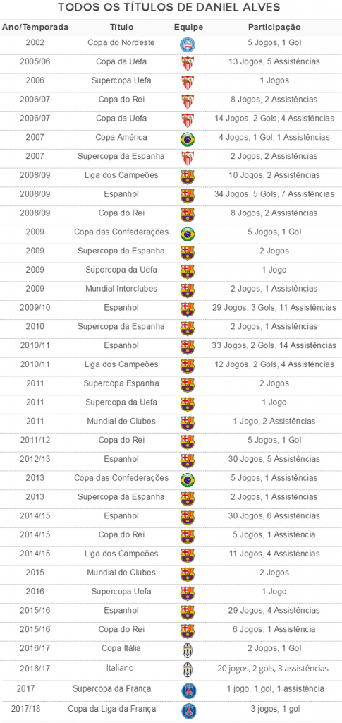 Neste sábado, Daniel Alves repetiu um gesto pela 36ª vez na carreira desde 2002: ergueu um troféu. O lateral-direito brasileiro conquistou a Copa da Liga Francesa com o PSG e se consolidou como o jogador mais vitorioso da atualidade e está perto de ser o maior campeão da história. Ele superou Ryan Giggs e o ex-lateral e agora dirigente do Paris, Maxwell, que têm 35 títulos. Contando torneios amistosos pela Seleção, Pelé lidera a lista, com 37.