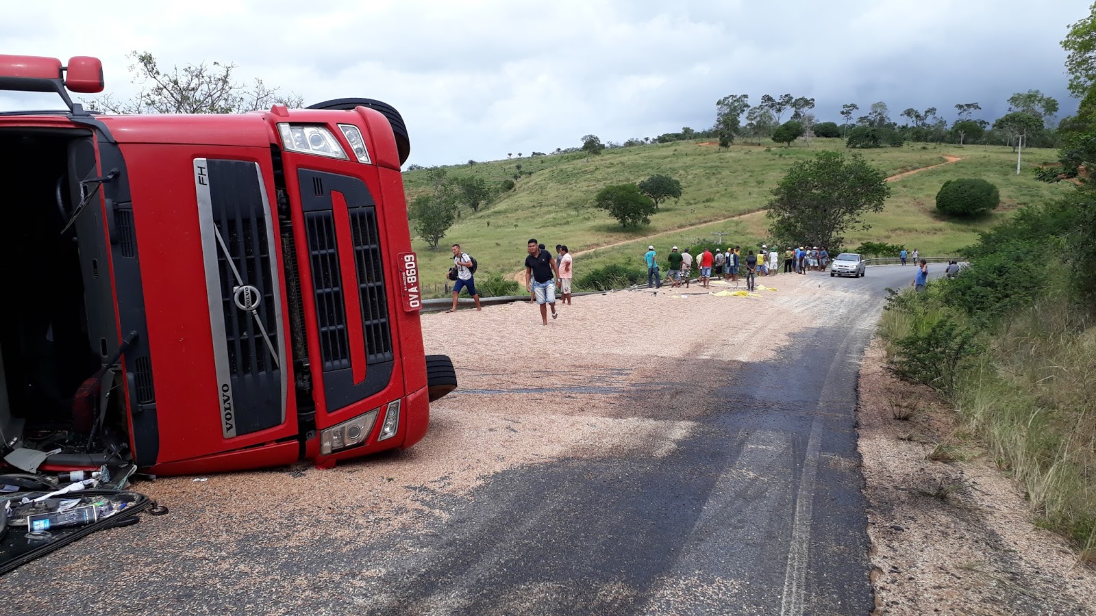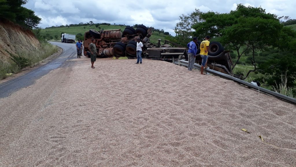 Não há informações detalhadas sobre o acidente. O feijão a granel ficou espalhando no local.