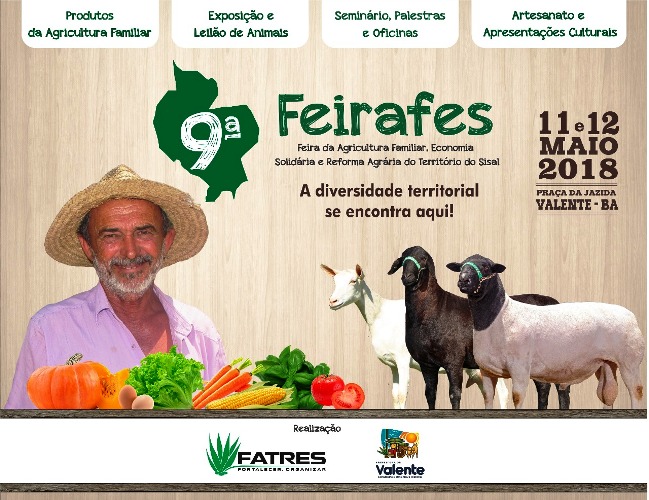 A 9ª Feira da Agricultura Familiar,Economia Solidária e Reforma Agrária do Território do Sisal (Feirafes), acontece nos dias 11 e 12 de maio, a partir das 09h, na Praça da Jazida em Valente – BA. O evento vai reunir Agricultores (as) familiares, produtores, criadores de animais, professores e estudantes de escolas técnicas, profissionais de agronomia, veterinários e demais áreas ligadas ao campo para uma troca de saberes e sabores durante os dois dias de evento.