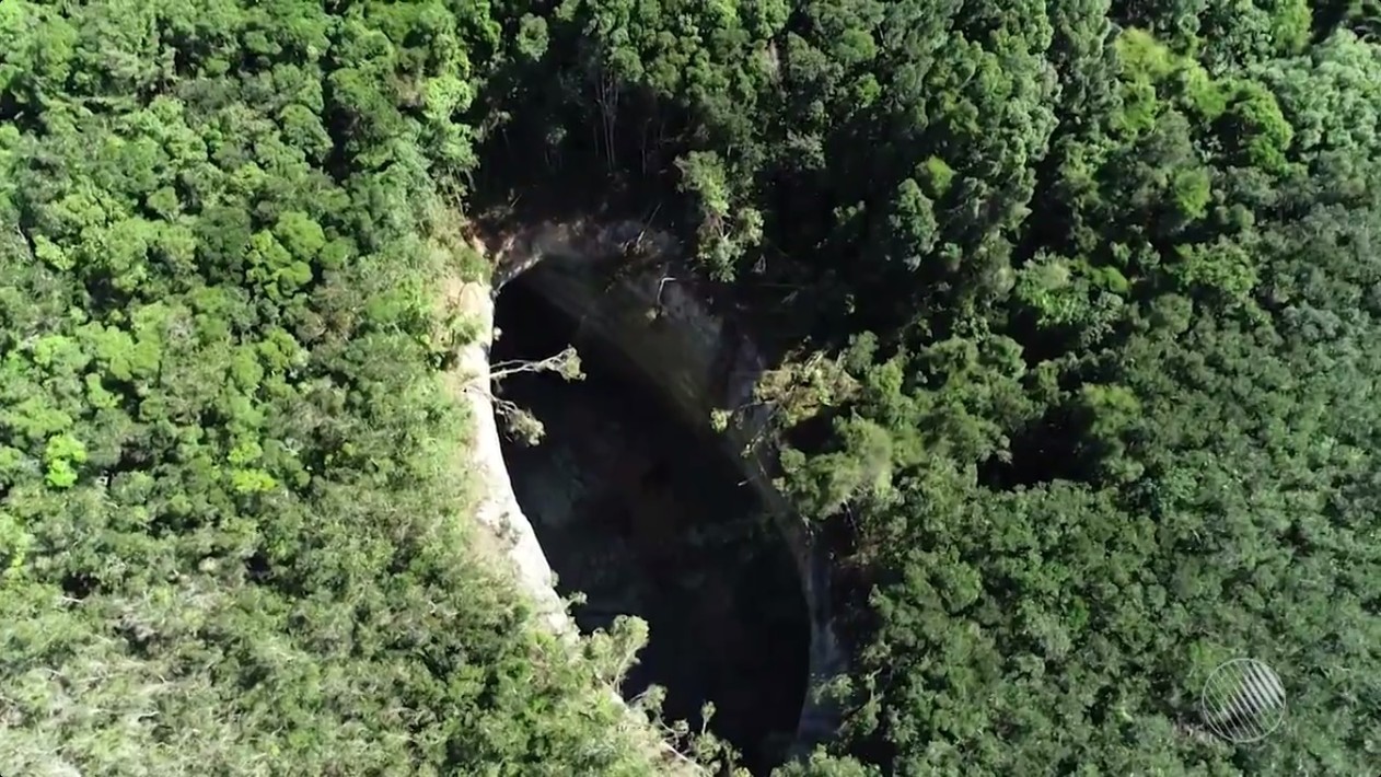 Cratera gigante misteriosa com quase 50 metros de profundidade surgiu na BA. (Foto: Reprodução/TV Bahia)