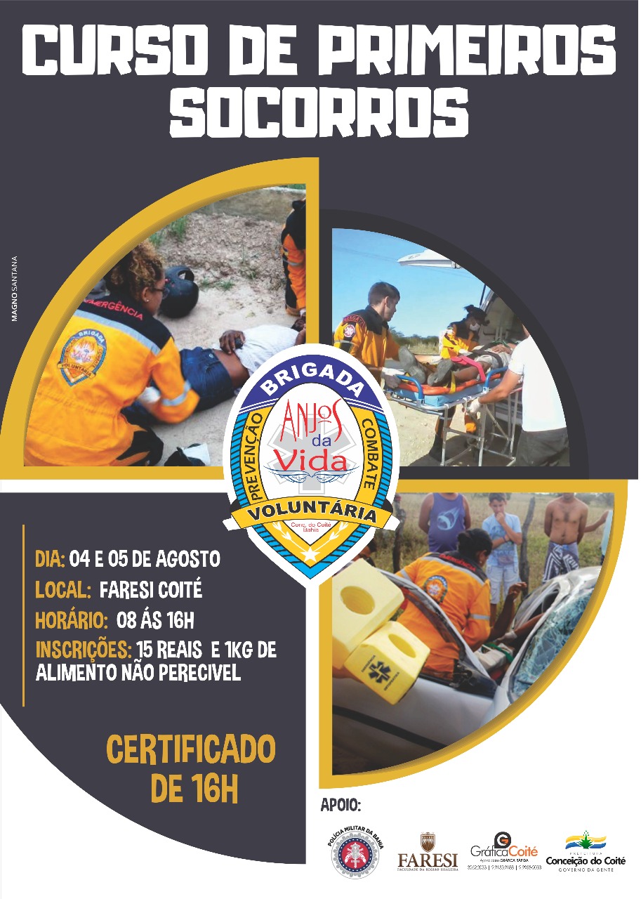 A Brigada Voluntária Anjos da Vida realizará um curso de primeiro socorros nos dias 4 e 5 de agosto, na Faculdade da Região Sisaleira – FARESI, para a população coiteense e região. O curso tem a finalidade de instruir as pessoas