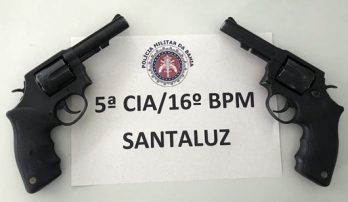 A Polícia Militar de Santaluz recuperou, na manhã desta segunda-feira (27), dois dos três revólveres que tinham sido furtados da agência do Banco do Brasil da cidade. De acordo com a corporação, por volta das 6h20, após denúncia de que numa casa na zona rural, próximo ao povoado do Miranda, havia algumas pessoas desconhecidas dos moradores.