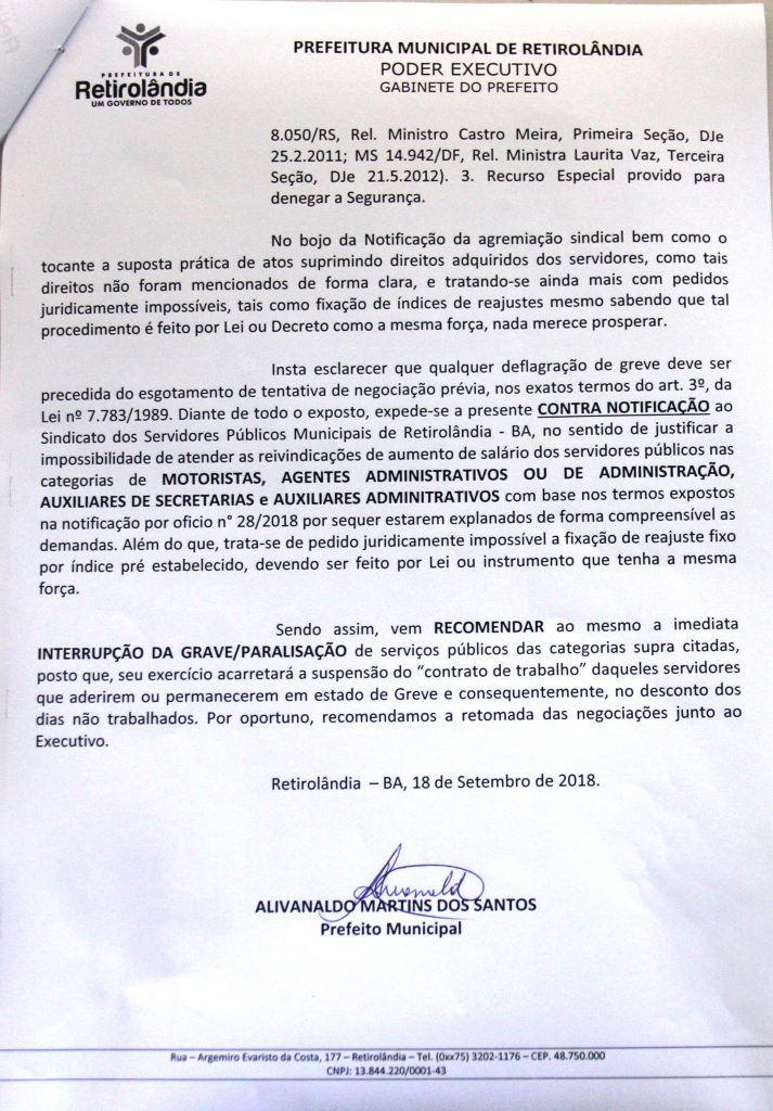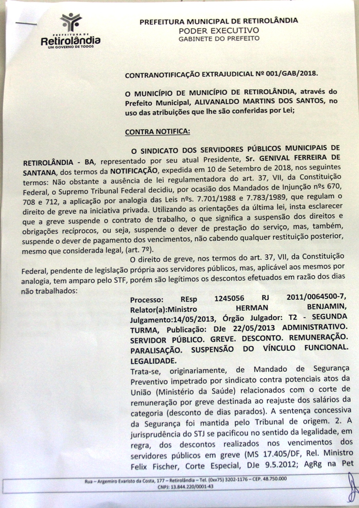 Na tarde desta terça-feira, 18, havia uma expectativa de o secretário de educação e o jurídico da prefeitura sentarem com os servidores para dar alguma posição sobre o assunto, mas apenas Eleaci chegou a sua sala e se limitou a entregar uma contranotificação extrajudicial ao presidente do Sindicato dos Servidores Públicos de Retirolândia, Genival Ferreira de Santana, “Tití” que pode ser lido na íntegra, recomendando a imediata interrupção da greve/paralisação, podendo, em caso de continuidade acarretar a suspensão do “contrato de trabalho” daqueles servidores que aderirem ou permanecerem em estado de greve e consequentemente, no desconto dos dias não trabalhados.