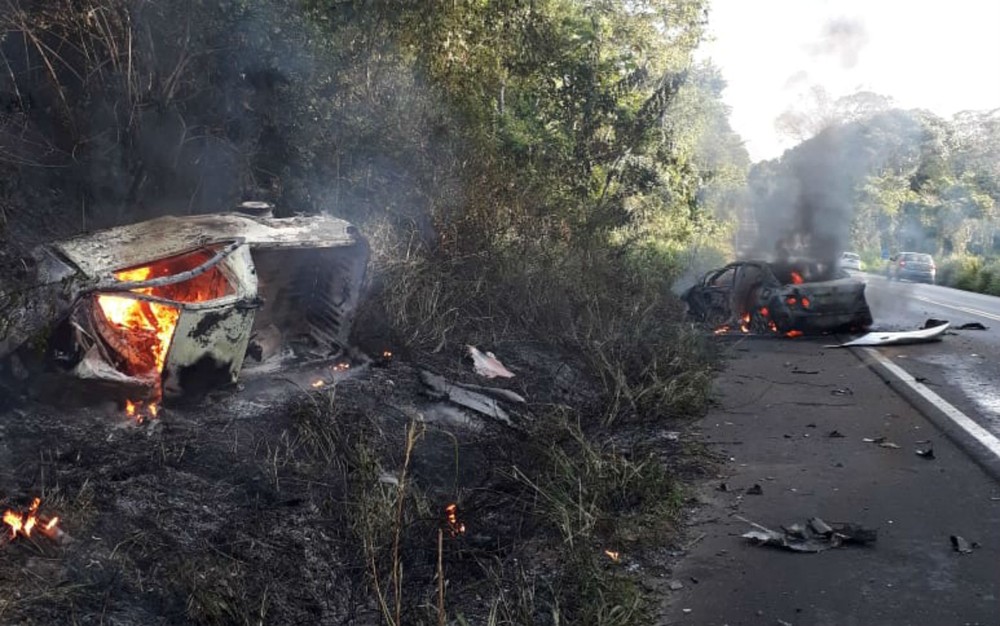 O acidente aconteceu no final da tarde de sábado (22). A Polícia Rodoviária Federal (PRF) ainda não tem informações do que pode ter causado a batida. Os dois veículos incendiaram logo após a colisão.