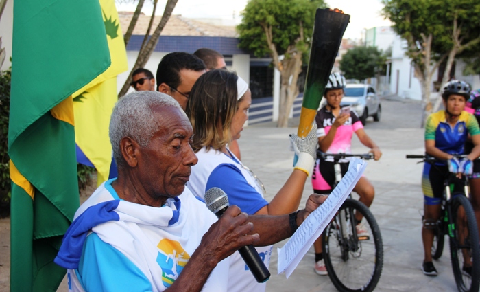 Luiz da Bicicleta como também é conhecido, ele que possuiu uma oficina de bicicleta em Serrinha, carrega sempre uma prancheta e em cada parada faz a leitura de como surgiu o fogo simbólico na região do sisal.
