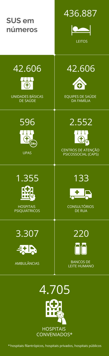 Entre os procedimentos mais frequentes, ao longo do ano passado, estão, por exemplo, consulta médica em atenção básica e especializada, visita domiciliar, administração de medicamentos em atenção básica e especializada, aferição de pressão arterial e atendimento médico em UPA (Unidade de Pronto Atendimento). A estrutura do SUS em todo o Brasil envolve 42.606 unidades básicas de saúde e o mesmo número de equipes do programa Saúde da Família, 596 UPAs, 2.552 centros de atenção psicossocial (Caps), 1.355 hospitais psiquiátricos, 436.887 leitos, 3.307 ambulâncias, 219 bancos de leite humano e 4.705 hospitais conveniados (públicos, filantrópicos e privados).