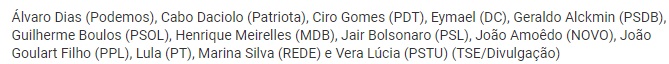 Os nome do candidato Fernando Haddad (PT) e sua vice, Manuela D’Ávila (PCdoB), foram considerados aptos para inserção nas urnas, apesar de o registro de candidatura ainda não ter sido julgado pela Corte. Haddad teve o nome confirmado pelo PT após o TSE barrar a candidatura do ex-presidente Luiz Inácio Lula da Silva. O prazo para que algum candidato, partido ou o Ministério Público Eleitoral (MPE) faça a impugnação do registro do petista termina amanhã (18), no entanto, até o momento, nenhuma contestação foi apresentada ao tribunal.