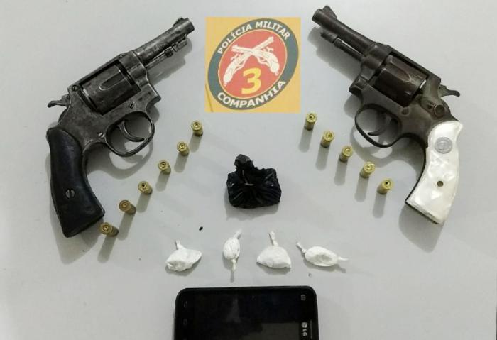 Uma moto Honda 125 preta (a qual consta em consulta como Azul), dois revólveres Taurus cal. 32. Um sob o registro de número 302821 e outro com numeração suprimida, ambos com todos os cartuchos deflagrados, sendo 6 e 5 estojos vazios respectivamente. Quatro petecas de cocaína, um papelote de maconha, um celular LG.