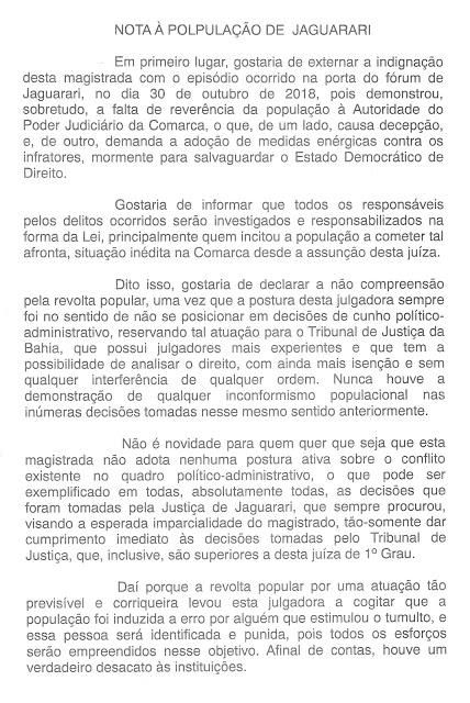 Juíza da Comarca de Jaguarari emite nota à população após sofrer atos de desrespeito e desacato