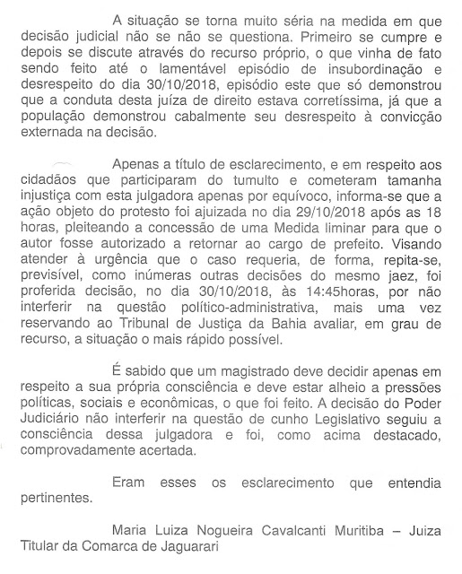 No final da tarde de terça-feira 30, após o final de expediente no fórum de Jaguarari, município do Norte da Bahia, quando a juíza da comarca Maria Luíza Nogueira Cavalcanti Muritiba deixava o local, foi recepcionada por uma multidão de cerca de 600 pessoas simpatizantes do prefeito cassado Everton Rocha, com vaias e xingamentos, em virtude da magistrada ter indeferido o retorno de Rocha a Prefeitura. A decisão agora cabe ao TJBA.