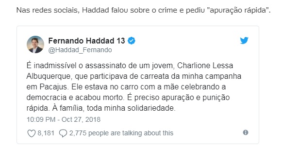 É com profundo pesar e indignação que informamos o assassinato de Charlione Lessa Albuquerque, de 23 anos, filho de Maria Regina Lessa, Secretária da Mulher Trabalhadora da Confederação Nacional dos Trabalhadores do Ramo Vestuário da CUT, CNTRV, ocorrido no início da noite deste sábado, 27, na cidade de Pacajus, interior do Ceará, durante uma carreta em apoio a Fernando Haddad.
