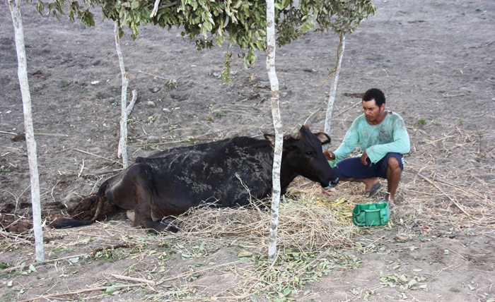 A principal rotina de Nego ultimamente tem sido tentar levantar uma vaca que caiu de fraqueza | Foto: Raimundo Mascarenhas
