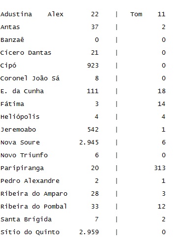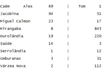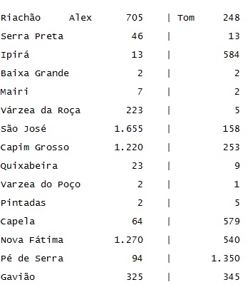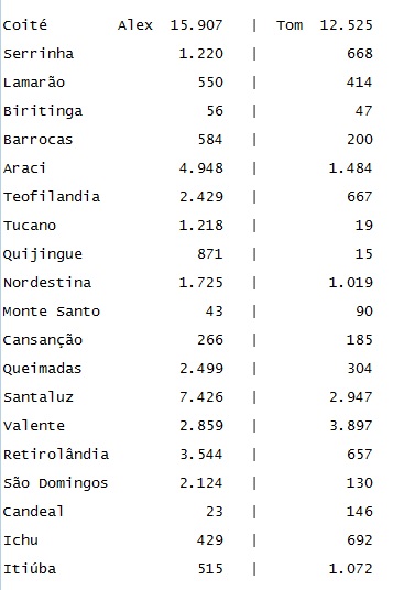 O Calila Noticias fez um levantamento da votação dos deputados coiteenses Alex da Piatã e Tom Araújo em cidades de seis territórios de identidade frequentadas pelos parlamentares e também por estarem próximas de Conceição do Coité, principal base eleitoral de ambos.