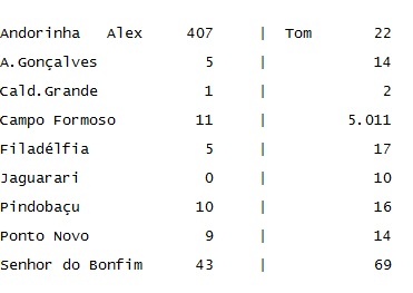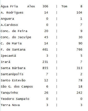 Na soma de cada grupo de cidades verifica-se a grande frente de Alex da Piatã, apontando a realidade da votação que o colocou na posição de sétimo colocado. Não foi possível buscar a votação dos dois em todos os territórios, pois, são 27 que englobam os 417 municípios. Mas que desejar realizar esta mesma pesquisa estamos disponibilizando este link de fácil acesso – https://placar.eleicoes.uol.com.br/2018/1turno/ba/apuracao-no-estado/#/34673-BA