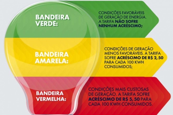 O sistema de bandeiras tarifárias foi criado, de acordo com a Aneel, para sinalizar aos consumidores os custos reais da geração de energia elétrica. A adoção de cada bandeira, nas cores verde (sem cobrança extra), amarela e vermelha (patamar 1 e 2) está relacionada aos custos da geração de energia elétrica. Na amarela há o acréscimo de R$ 1 a cada 100 kWh (quilowatts-hora). Na vermelha no patamar 1, o adicional nas contas de luz é de R$ 3 a cada 100 kWh; no 2, o valor extra sobe para R$ 5.