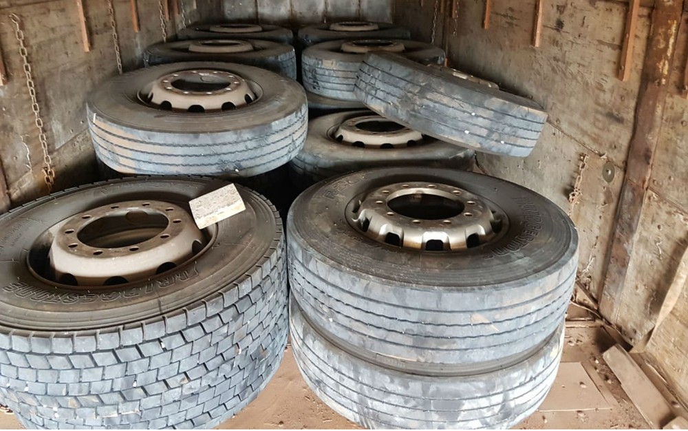 Segundo a Polícia Militar, foram apreendidos 22 pneus completos de carreta, um caminhão, R$526 em espécie, sete abraçadeiras e um celular.