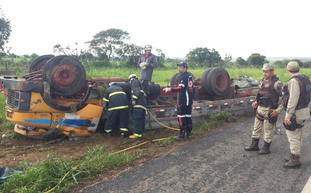 O caminhão seguia sentido Brasília, e um dos carros trafegava atrás dele. O motorista do segundo carro de passeio, que seguia no sentido contrário, perdeu controle da direção e, para evitar a batida, o condutor do caminhão desviou para o acostamento, mas o veículo acabou tombando na pista. O automóvel que estava fora de controle acabou batendo com o outro carro de passeio.