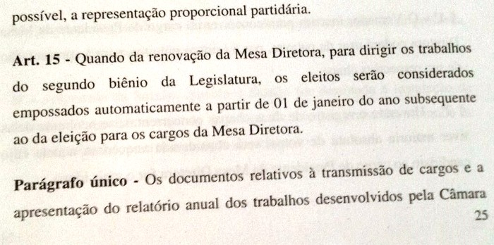 Para comprovar sua informação, Jota encaminhou o printer da página do regimento em que parece o artigo citado pra correção do texto veiculado na matéria “São Domingos I – Com ausência dos vereadores governistas, nova Mesa Diretora da Câmara é empossada”, onde é citado como presidente, quando já estava ex-presidente.