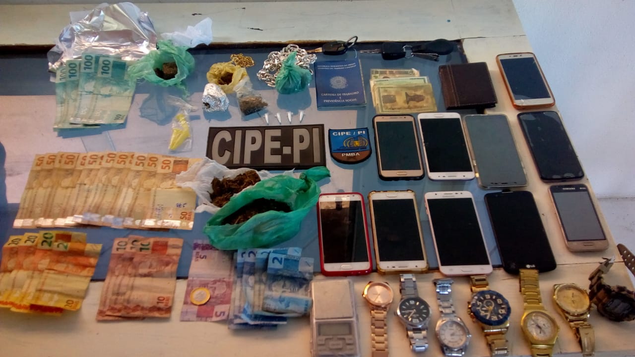 Com o grupo de criminosos foram apreendidos 121 pedras de crack, cinco pinos de cocaína, sete trouxas de maconha, balança, embalagens plásticas, celulares e pouco mais de R$ 1 mil reais em espécie conquistados com o comércio ilícito.