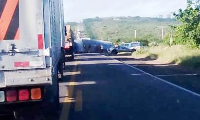 O tombamento de uma carreta pouco antes da 07h desta segunda-feira, 15, deixou o trânsito lento no trecho da BR 116 Norte, sentido Serrinha/Santa Bárbara.